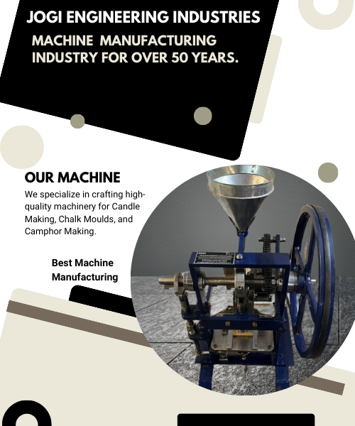 Jogi Engineering Industries, where we have been pioneers in the manufacturing industry for over 50 years. We specialize in crafting high-quality machinery for Candle Making, Chalk Moulds, and Camphor Making. Whether you require standard solutions or bespoke designs, our commitment to precision and reliability ensures we meet diverse manufacturing needs with excellence.